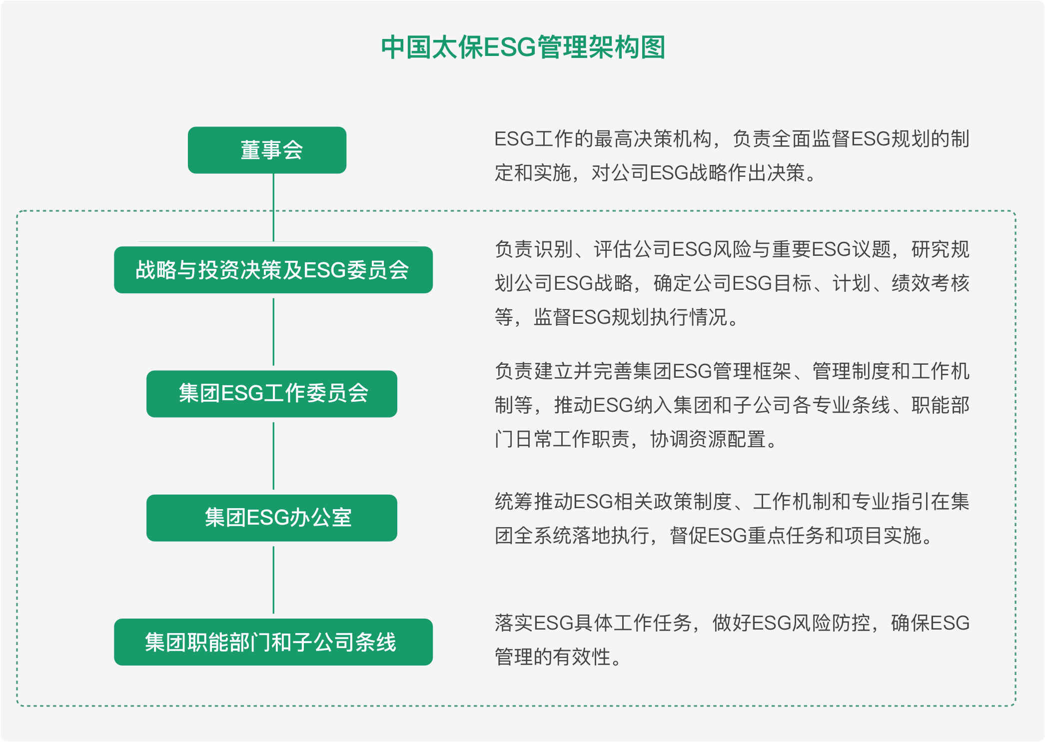 中國(guó)太保建立了層次分明、分工明確的“董事會(huì)-管理層-執(zhí)行層”的完整ESG治理架構(gòu),為集團(tuán)自上而下履行ESG實(shí)踐提供了良好的管理基礎(chǔ)和組織保障。中國(guó)太保董事會(huì)執(zhí)行董事和管理層的績(jī)效薪酬與ESG指標(biāo)表現(xiàn)相掛鉤。
