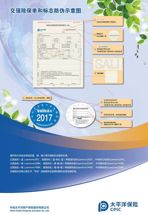 一看,識別單證真?zhèn)?。要仔細辨別單證是否具有監(jiān)管要求的防偽技術。一是,交強險單證正本左上角“中國保險監(jiān)督管理委員會監(jiān)制”、右上角“限在×××銷售”字樣,并應使用紅色熒光防偽油墨,在紫外燈下發(fā)紅色;二是,交強險單證標題下有一條以“SALI”為內容的微縮文字形成的橫線,與標題等長,在5-10倍以上放大鏡下清楚可辨;三是,交強險單證滿版由轎車和貨車圖案做浮雕底紋,中間可見光柵效果的“SALI”四個字母。
