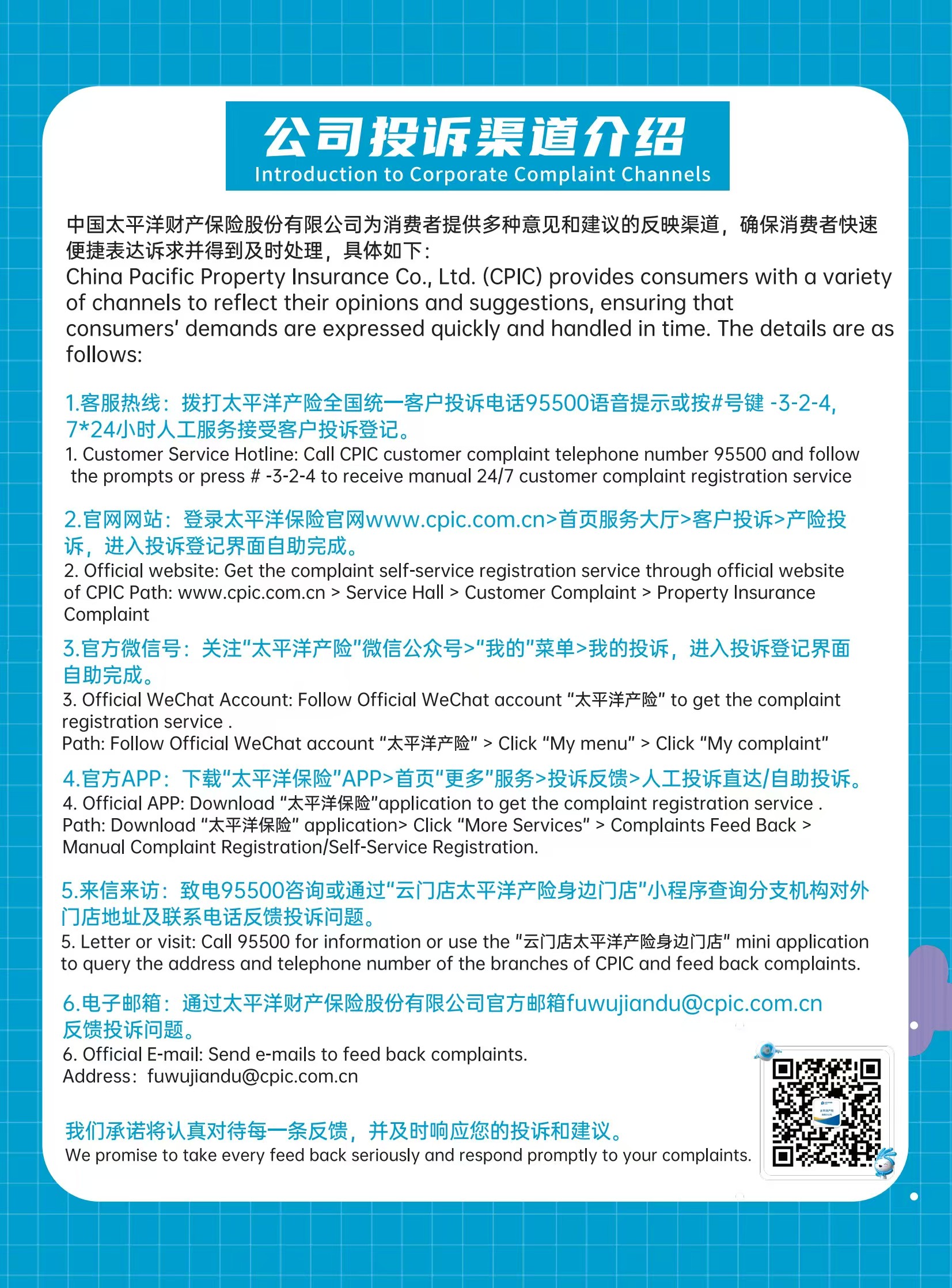 太平洋產(chǎn)險全國統(tǒng)一客戶投訴電話:95500語音提示或按#號鍵-3-2-4