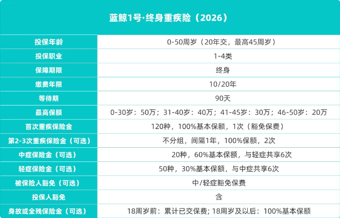 海豚君家的新品——藍(lán)鯨1號(hào)·終身重疾險(xiǎn)(2026),可以按需靈活定制,各項(xiàng)保障責(zé)任也很給力!
