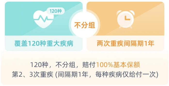 但藍(lán)鯨1號(hào)除了120種重疾的首次保障,還能選擇重疾二、三次賠,疾病不分組,間隔期僅1年。