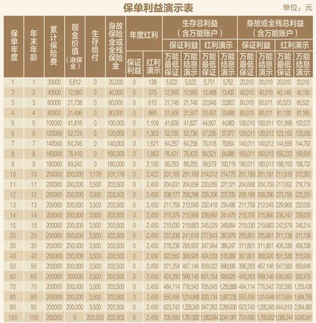 | 保單年度 | 累計(jì)保費(fèi) | 現(xiàn)金價(jià)值 (退保金) | 年度紅利 | 生存總利益(含萬(wàn)能賬戶) | 身故或全殘總利益(含萬(wàn)能賬戶) | |||||||